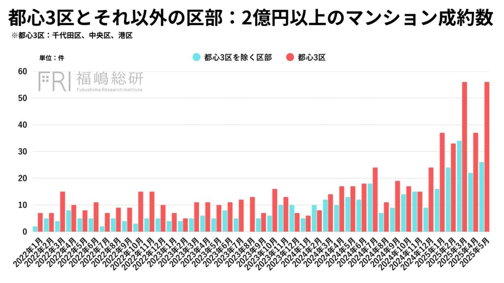 グラフ分析によれば、2億円以上の成約件数は都心3区・その他区部を問わず増加傾向にある。この現象は、富裕層を中心とする購買力の強さを示すものである。特に国内外の富裕層は、居住用というよりも資産保全や投資対象として高価格帯マンションを取得する傾向が強い。