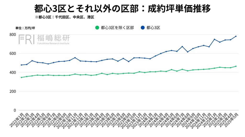 東京都23区全体の中古マンション価格は、長期的に右肩上がりで推移してきた。グラフ分析によれば、都心3区以外の区部はおおむね直線的かつ堅調な上昇を示すのに対し、都心3区は非線形的、すなわち加速度的に価格が上昇している。2025年5月末時点で、都心3区の成約坪単価は過去最高水準に達しており、依然として上昇トレンドの中にあると解釈できる。