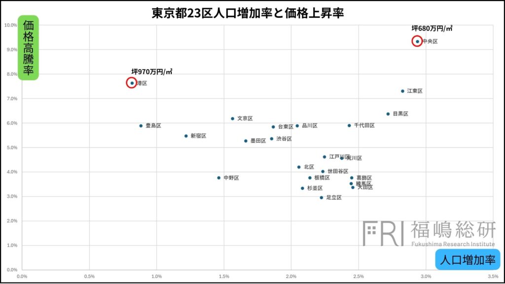 中央区は人口増加率が高く、それに伴って価格も上昇している。対照的に港区では、価格は高騰しているが人口はむしろ停滞しており、新規流入が制限されている。これは、港区における価格水準が過剰に高まり、実需が追随できなくなった結果、既存富裕層による住み替えや資産入れ替えに支えられていることを示唆する。いわば「閉じた市場」である。一方、中央区では相対的に現実的な水準を維持し、新規の居住需要を吸収しており、需給の健全性が確認できる。