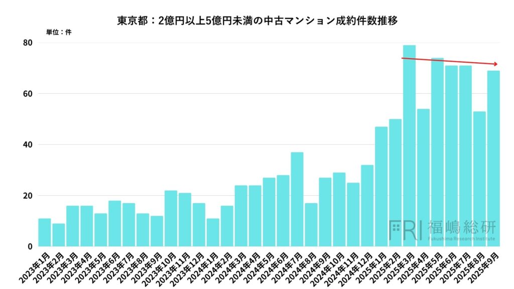 一方で、2億円以上5億円未満の中間高級帯では、成約件数の伸びが鈍化しています。2023年頃までは都心部の中核的な取引ゾーンであり、企業経営者や外資系エグゼクティブ層、富裕層などによって支えられていました。しかし、2024年後半からの取引状況を見ると、徐々に停滞感が見られるようになっています。
