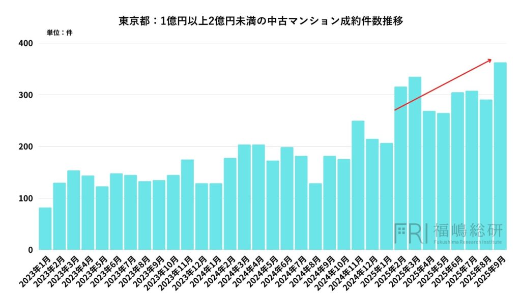 特に東京都心3区においては、中央区は横ばい傾向にある一方、千代田区は緩やかに減少し、港区では2025年夏以降、成約件数が大きく減少しています。この減速の背景には、価格と品質の乖離が存在します。近年、都心では地価や建築費の高騰により、築年や立地条件に見合わない高額中古物件が増加しています。具体的には、もともと1.5億円クラスであるべき物件が、相場上昇に伴って2億円を超える価格で市場に出るケースが目立つようになりました。このような物件では、購入層から「この価格であれば新築を選ぶ」「条件の良い別のエリアを検討する」「海外投資に切り替える」といった選択が増え、結果として取引件数の減少につながっています。中間高級帯は、価格上昇が購買心理に直接影響を与えやすいセグメントであり、今後の市場動向を読む上で注視すべき価格帯といえます。