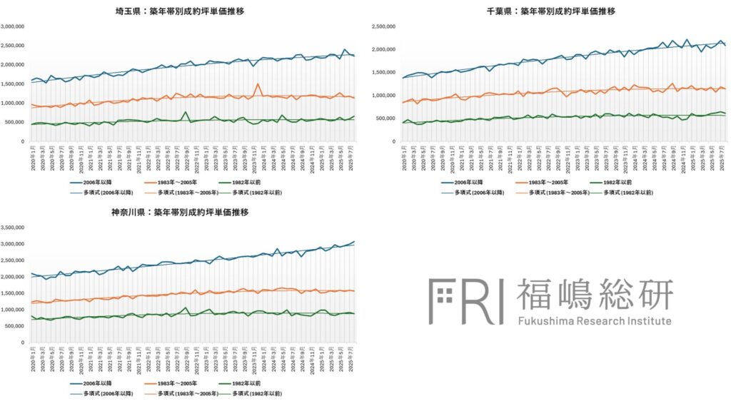 一方、埼玉県、千葉県、神奈川県では、販売日数が緩やかに増加しており、物件が成約するまでに時間を要する状況が見られます。値下げ回数は横ばいで推移しており、売主側は価格期待を維持しているものの、購入者の資金負担が増しているため、成約が遅れる傾向にあります。特に、築浅マンションの価格が高額であるため、周辺県では購入が難しくなり、比較的低価格帯の築年が古い物件への需要シフトが進んでいます。