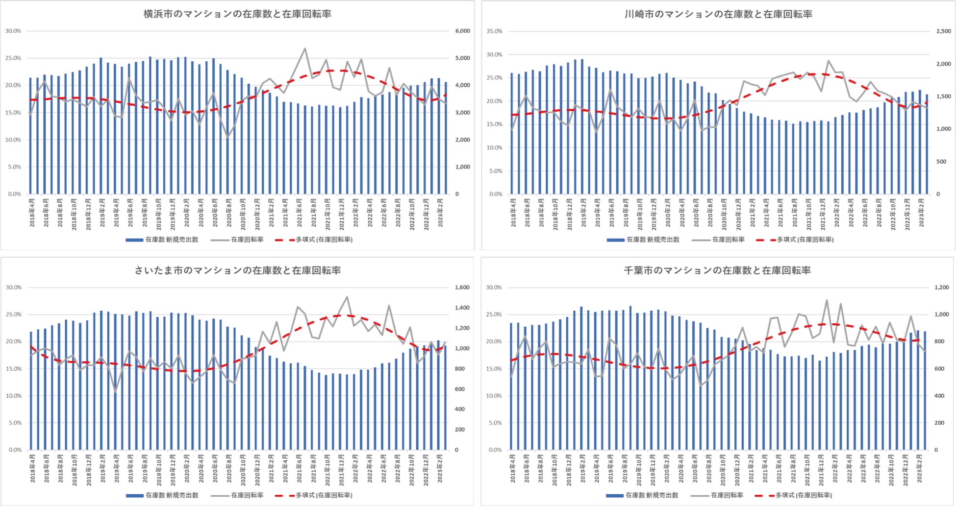 神奈川県横浜市、川崎市、さいたま市、千葉市では、東京都23区と異なる動きが見られています。23区は価格改定数が大きく減少している中、同エリアはいずれもじわじわ増加傾向に。売主の強気な姿勢が軟化しています。とはいえ、在庫数と在庫回転率に鑑みれば、まだ価格上昇の余地はあるものと考えられます。