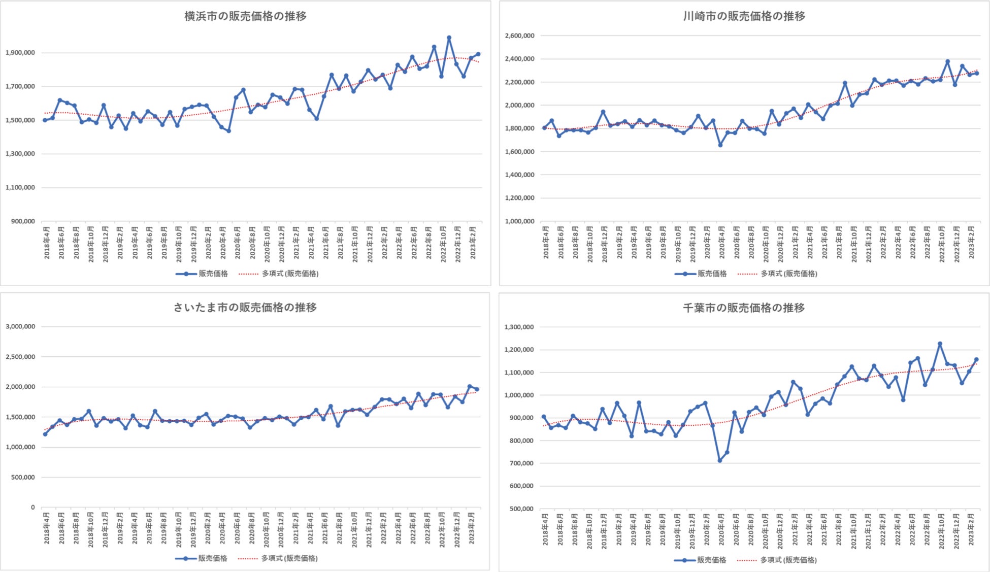 首都圏の中で東京都23区を除く神奈川県横浜市、川崎市、埼玉県さいたま市、千葉県千葉市の4つの主要都市では、同様の動きを見せています。