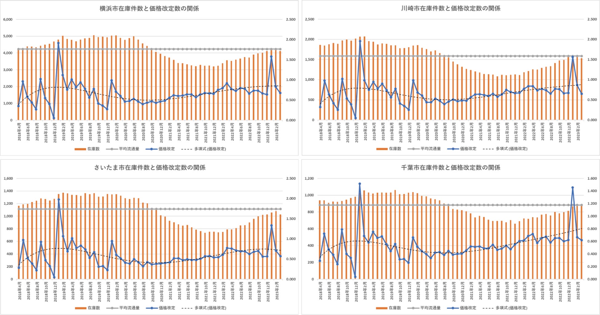 これは、東京都23区とは異なる動きです。とはいえ、本来であれば、在庫数が増えれば価格改定も増えるのが市場原理。横浜市、川崎市、さいたま市、千葉市はトレンドに即応した動きが見られます。