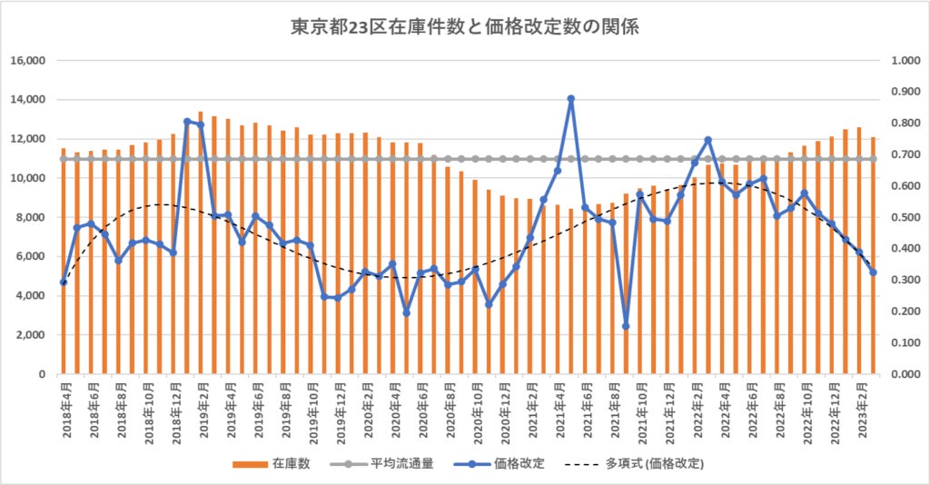価格改定数は、基本的に在庫件数と連動するものです。しかし、2022年下半期から在庫数が増えているにもかかわらず、価格改定数は大きく減少しています。