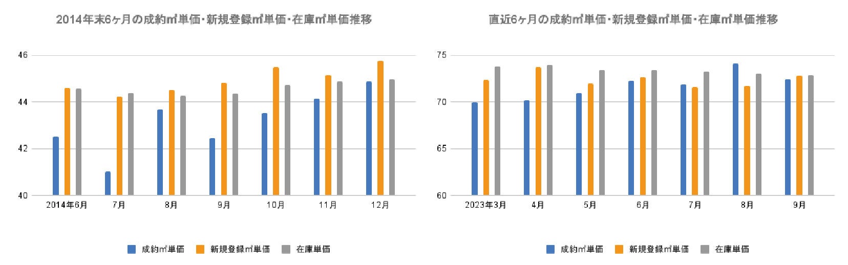 上記グラフの棒線は青が成約物件の平米単価・オレンジが新規登録物件の平米単価・灰色が在庫物件の平米単価を表しています。