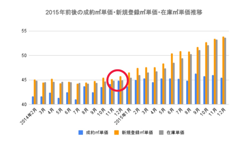 上記グラフは、2015年前後の成約平米単価・新規登録単価・在庫平米単価を抽出したものです。2014年初頭から成約価格が徐々に高騰するにつれ、2014年末には3つの価格がほぼ同額となり、2015年初頭以降は新規登録価格が在庫価格や成約価格を大きく上回る期間が続き、成約価格も引っ張られるように徐々に高騰していきました。