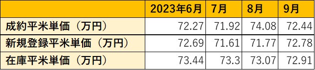 2023年6月〜9月の成約平米単価・新規登録平米単価・在庫平米単価