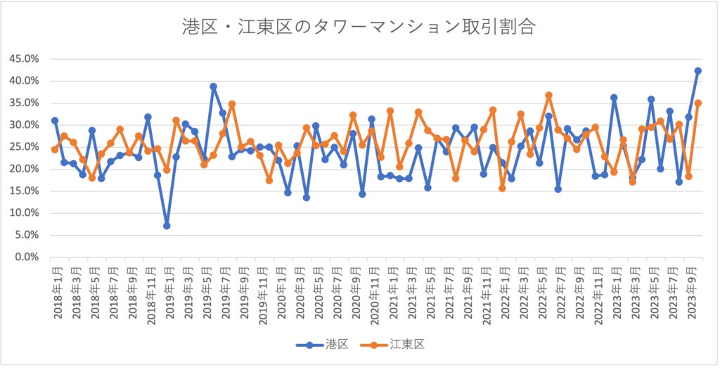 両区の成約マンションのうちタワーマンションが占める割合は、2018年から20〜30%程度で推移しています。一方、2023年10月の比率は、港区が42.3%、江東区が35.1%。この比率は2018年1月以降、港区は1位、江東区は2位です。