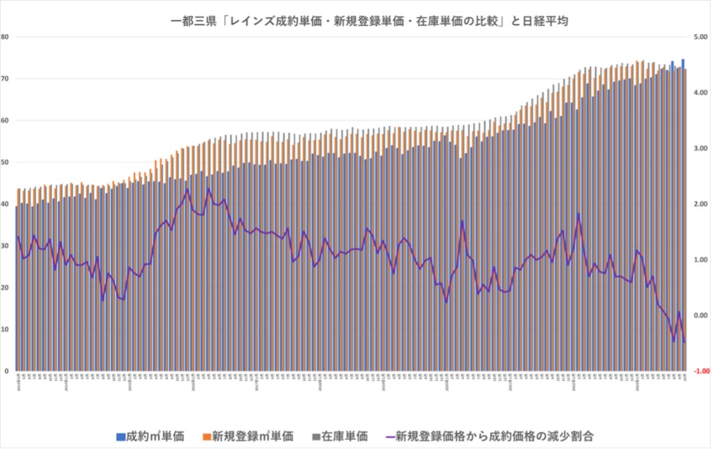 上記グラフは、一都三県の成約平米単価・新規登録平米単価・在庫単価の推移を表したものです。