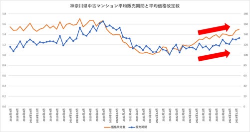 弊社では、中古マンション価格分析における独自の先行指数として「平均価格改定数」=「値下げした回数」と、「平均販売期間」=「売れるまでにかかった日数」を重要視しています。
