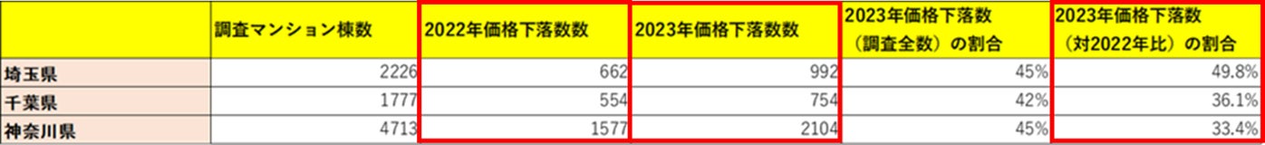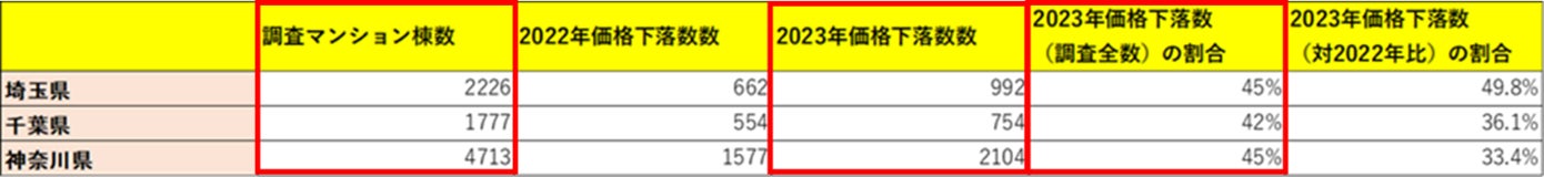 表2の赤枠部は、左から埼玉県・千葉県・神奈川県における調査対象の中古マンションの母数と2023年に下落した中古マンション数及びその割合を示しています。