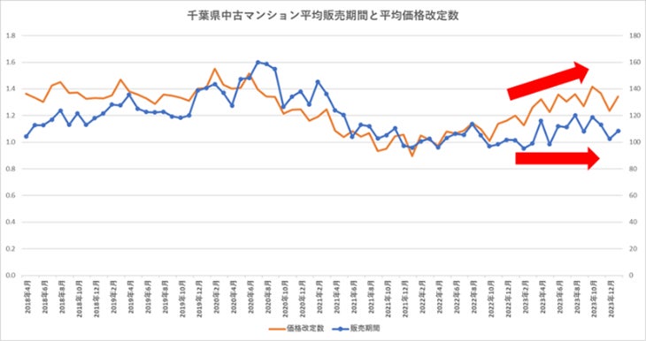 グラフ3:千葉県の中古マンションの均販売期間と平均価格改定数