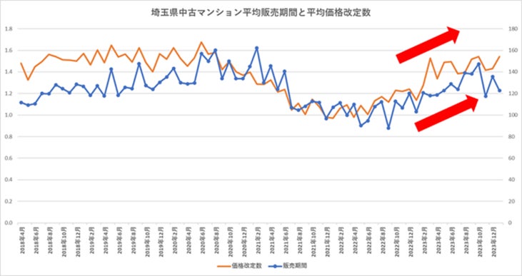 グラフ2:埼玉県の中古マンションの平均販売期間と平均価格改定数