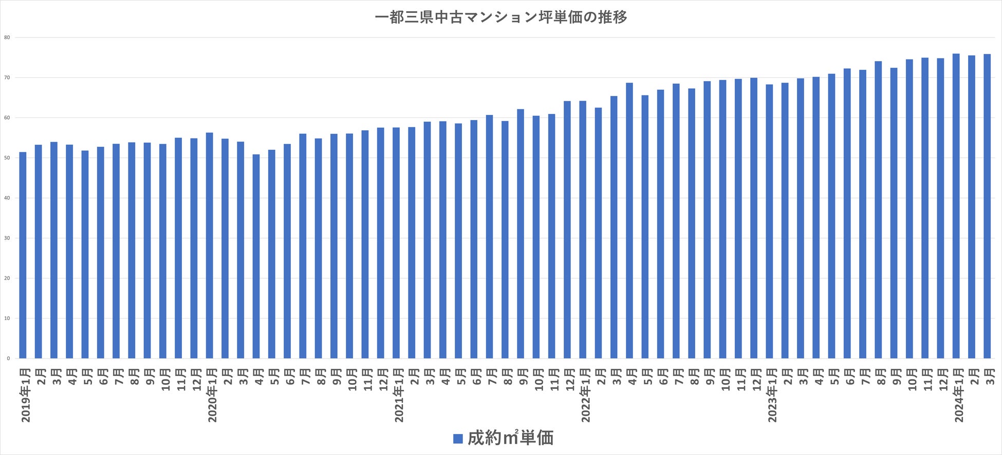 上記のグラフは、一都三県各月の中古マンション平均成約㎡単価を示しており、2013年3月より2024年3月に至るまで増加の一途を辿っている事が分かります。