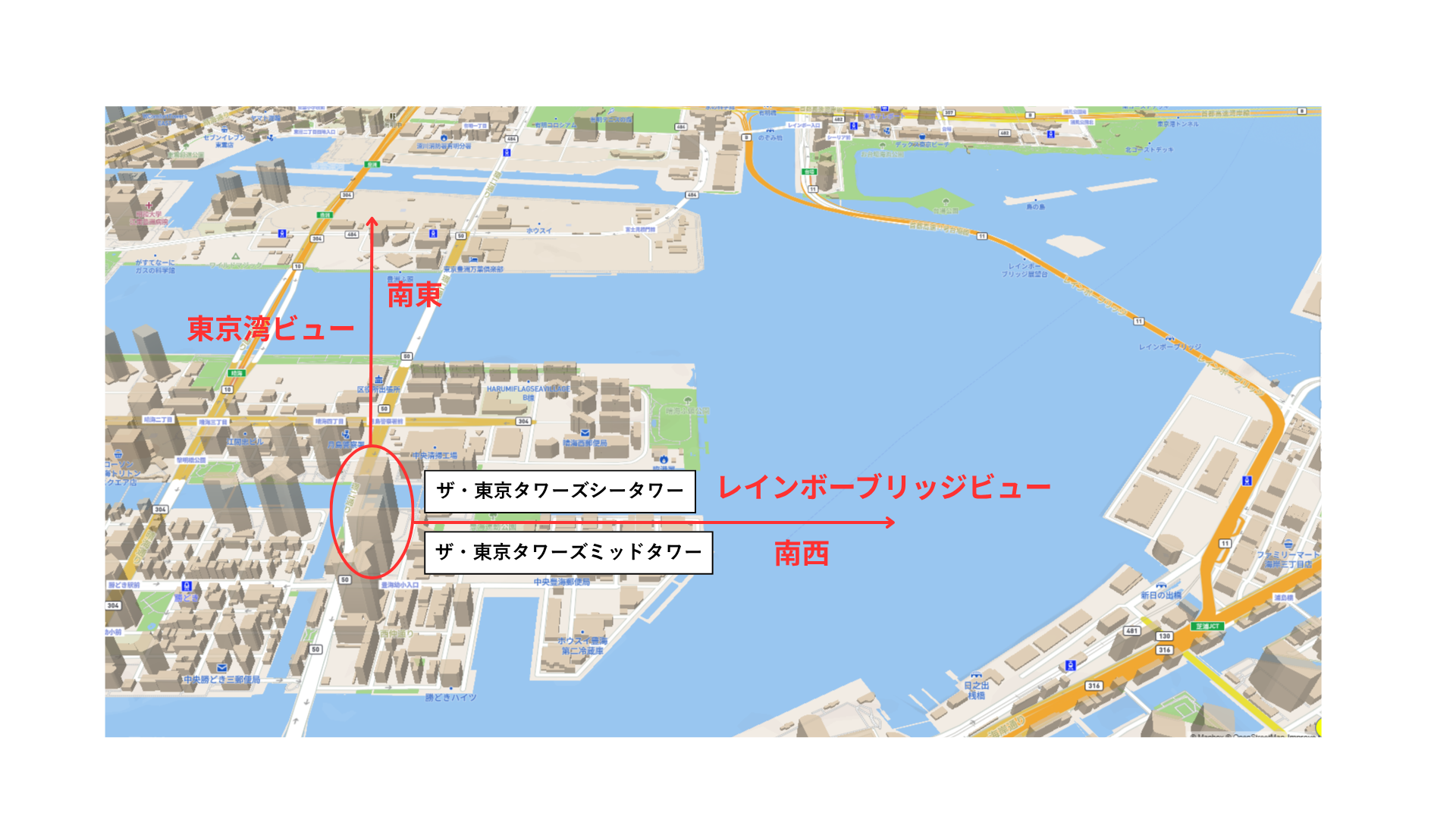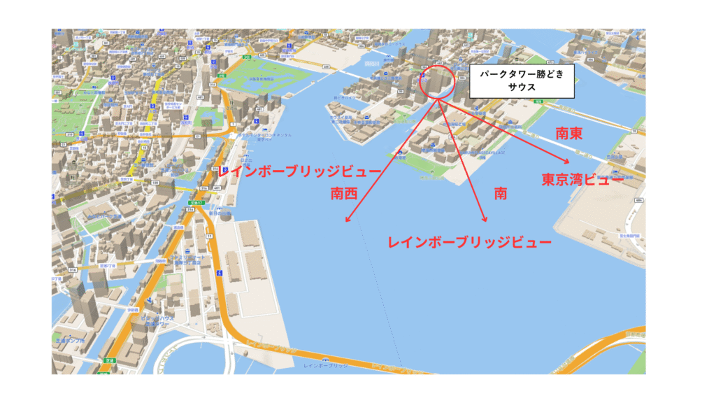 南西:レインボーブリッジを正面に望むことができ、夜景や開放感の面で圧倒的な価値。 南東:東京湾の水平線まで見渡せる景観が魅力。