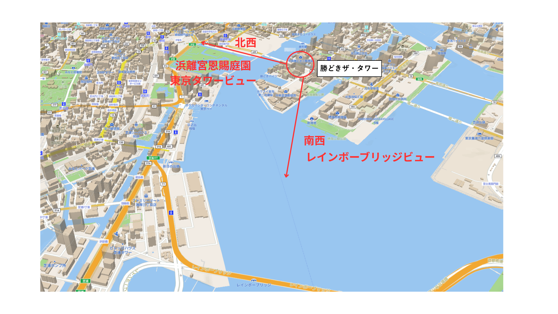 南西:レインボーブリッジビュー。湾岸ならではの眺望資産として高く評価。 北西:浜離宮恩賜庭園と都心の高層ビル群を一望できる点が大きな魅力。