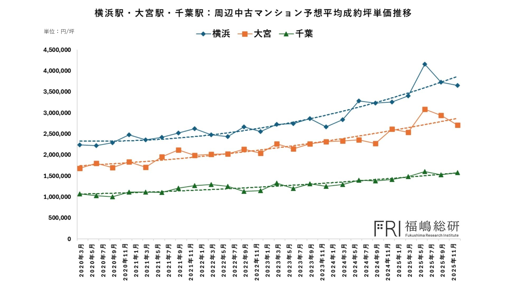 以下のグラフでは、東京駅から30~40分圏に位置する横浜駅(神奈川県)、大宮駅(埼玉県)、千葉駅(千葉県)について、中古マンションの予想平均成約坪単価の時系列推移を示しています。