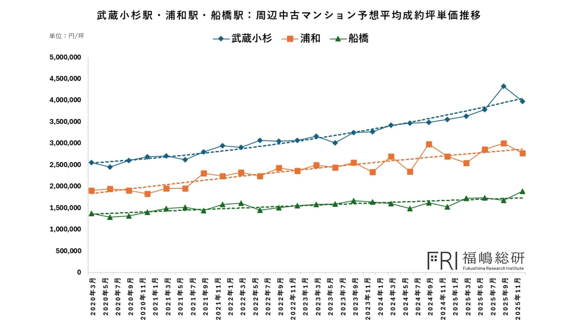 こちらのグラフでも、価格水準および上昇トレンドは「武蔵小杉 → 浦和 → 船橋」の順となっており、都心近接性とエリアブランド力の差が明確に価格に反映されています。