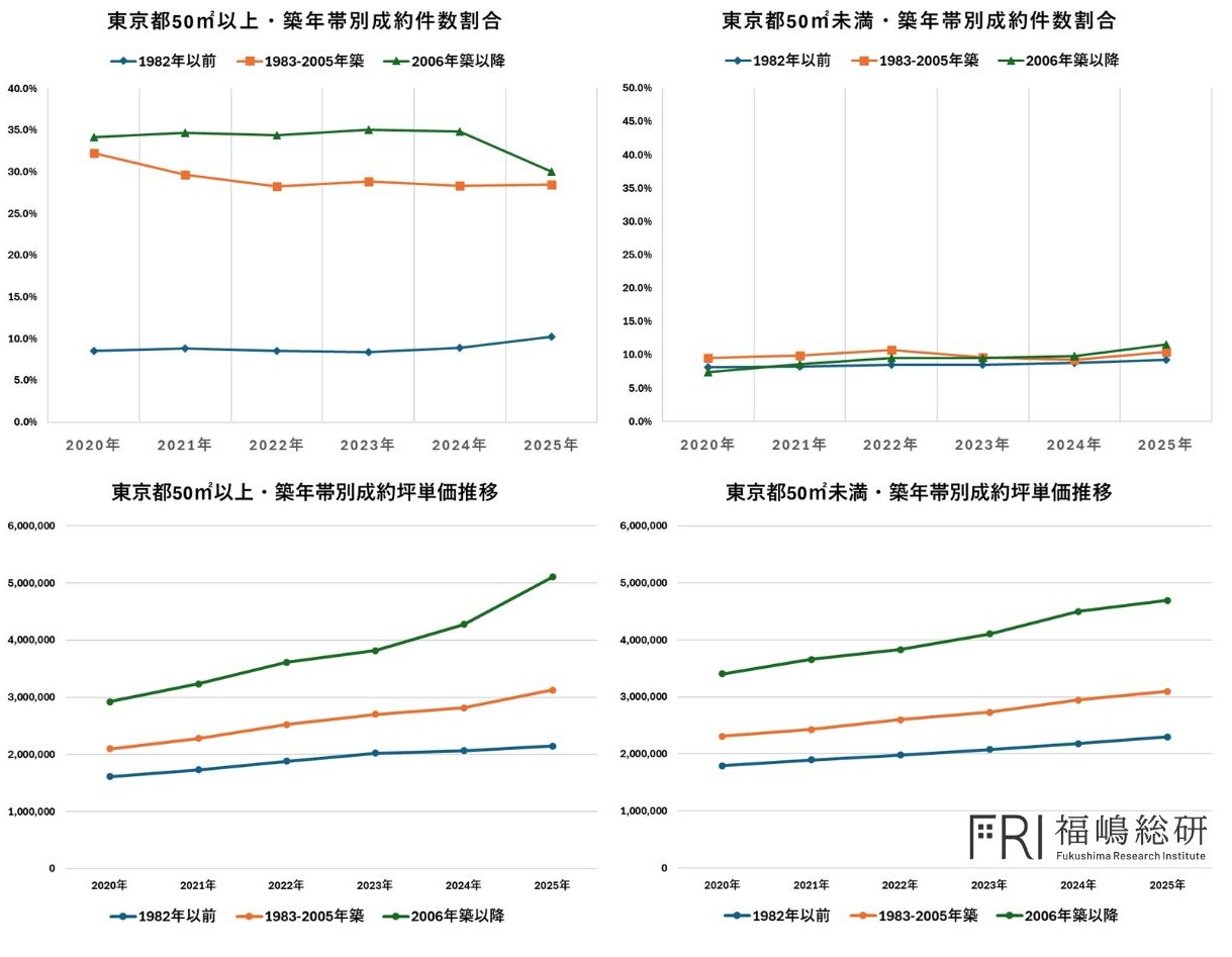 一方で、50㎡未満の各セグメントでは成約件数の割合が上昇しています。東京都ではすべてのセグメントで成約坪単価が上昇しているため、最も坪単価の高い築浅・高面積帯の比率が下がっても、平均坪単価自体は上昇する結果となりました。ここには、価格上昇の裏側で起きている需要の質的変化、すなわち「どの価格帯で、どのような物件が選ばれているのか」という構造変化が表れています。