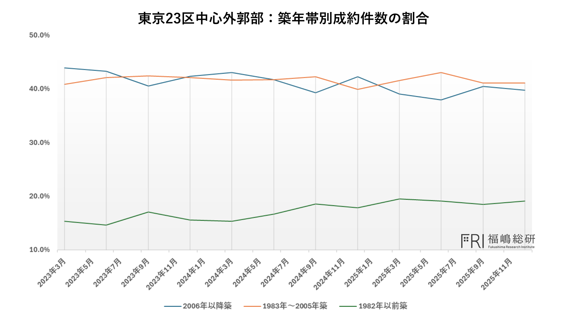 次に、これら太枠内エリアにおける築年帯別の成約件数割合の推移を見ると、極めて特徴的な傾向が確認されます。とりわけ、築20年未満の物件が占める成約件数の割合が非常に高く、他のエリアと比較しても際立った水準にあります。